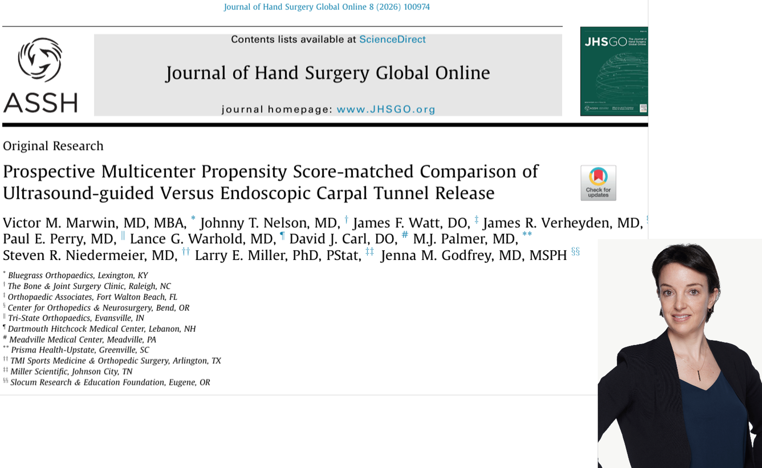 Reference: Victor M. Marwin, Johnny T. Nelson, James F. Watt, James R. Verheyden, Paul E. Perry, Lance G. Warhold, David J. Carl, M.J. Palmer, Steven R. Niedermeier, Larry E. Miller, Jenna M. Godfrey, Prospective Multicenter Propensity Score-matched Comparison of Ultrasound-guided Versus Endoscopic Carpal Tunnel Release, Journal of Hand Surgery Global Online, Volume 8, Issue 3, 2026, 100974, ISSN 2589-5141, https://doi.org/10.1016/j.jhsg.2026.100974.